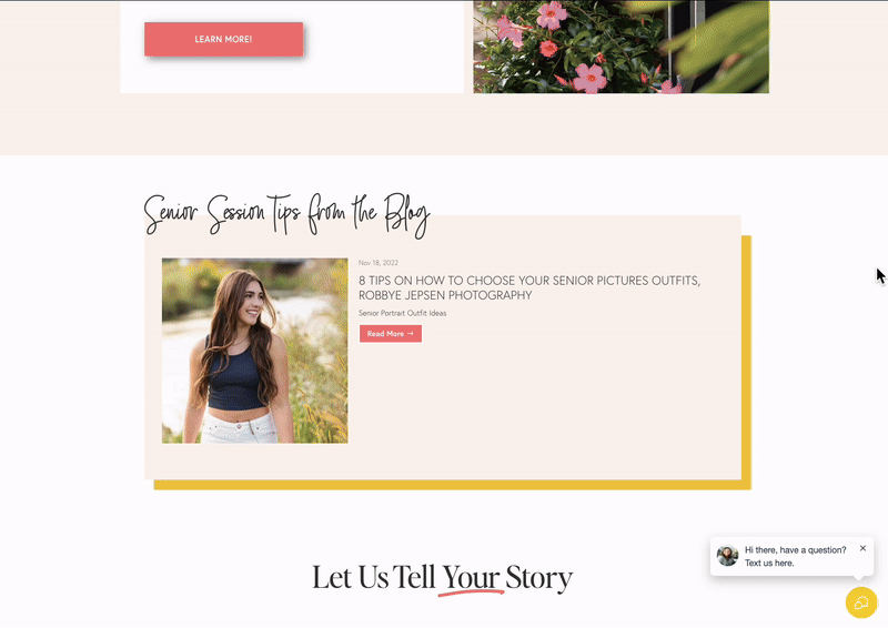 A top-rated senior portraits and branding photographer based in Crystal Lake, Illinois sought a punchy redesign of her website including a bright and colorful aesthetic and custom features to promote her portfolio and attract new clients for branding and senior portraits.